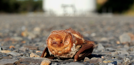 Photo credit: A dead eastern red bat is found at the Locust Ridge Wind Facility near Hazleton, PA. Photo by Michael Schirmacher/Bat Conservation International.
